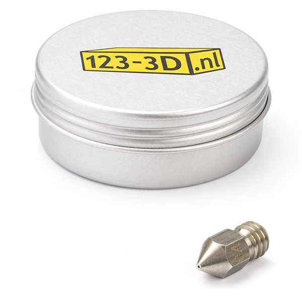 Use this high quality MK8 nozzle from our 123-3D brand to achieve accurate prints. This nozzle is made of hardened steel, which is very resistant to weathering by abrasive filament types such as metal filament and glow-in-the-dark filament. This nozzle is suitable for mounting on MK8 hot ends and has an M6 screw thread.